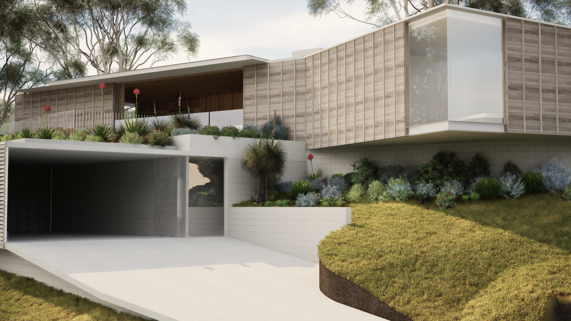 Without a traditional street frontage, the house retreats into the landscape, a quiet participant within its bushland setting. The buildings form is embedded into the sloping site, allowing the surrounding vegetation and topography to take precedence.