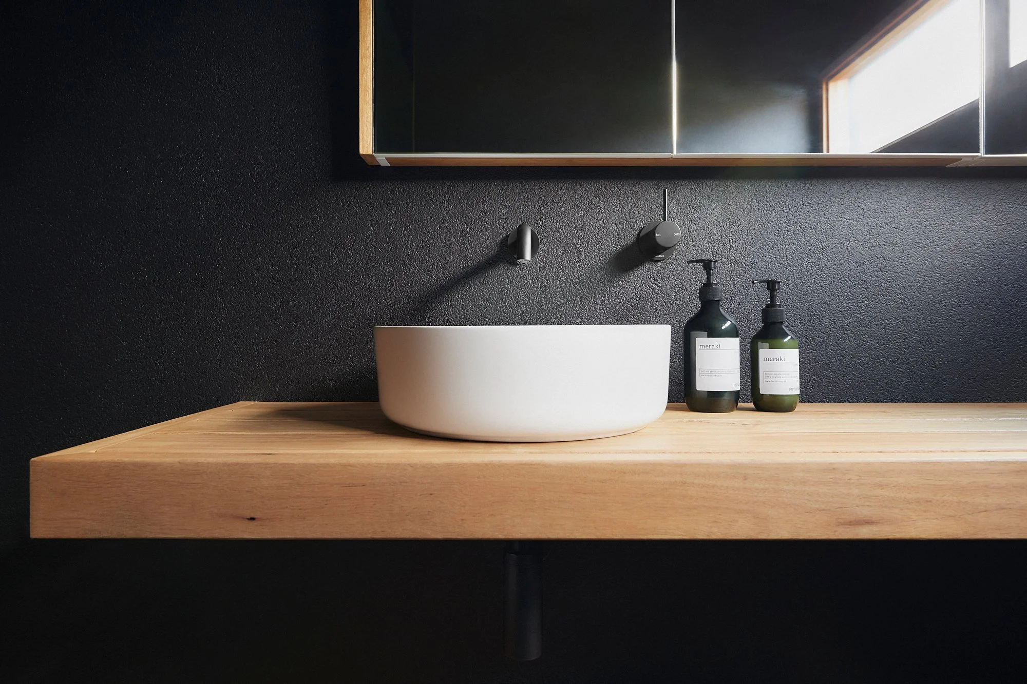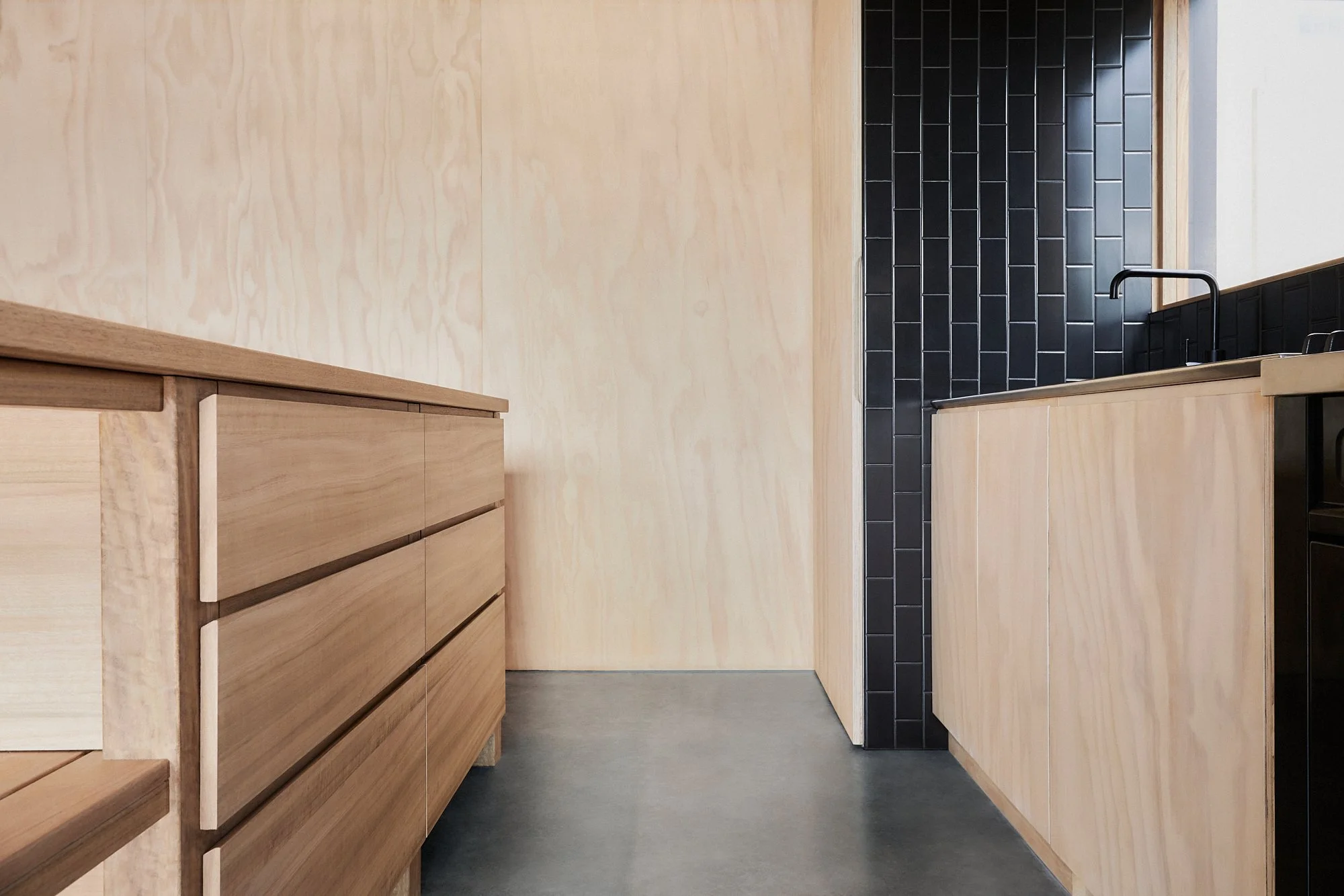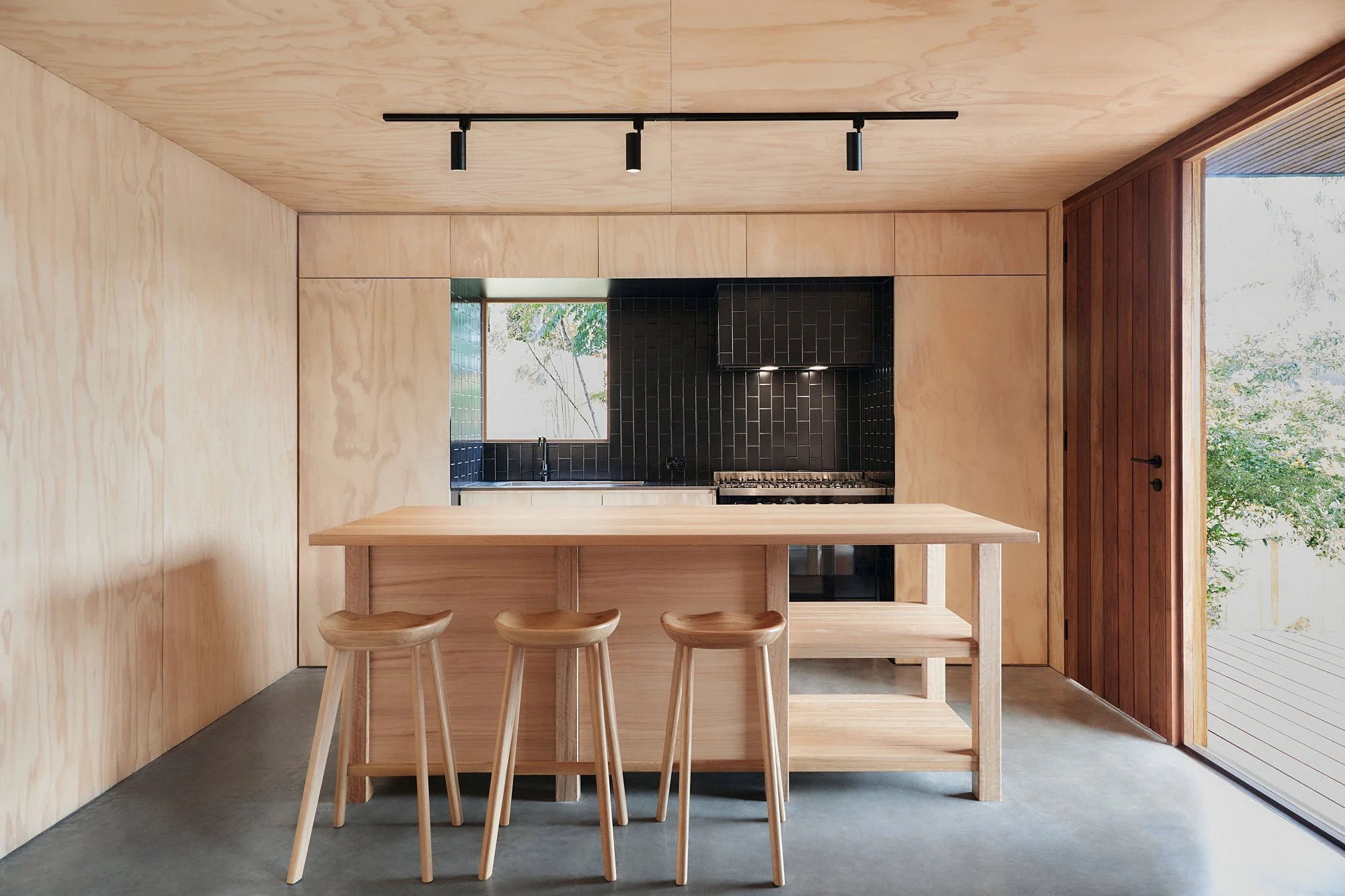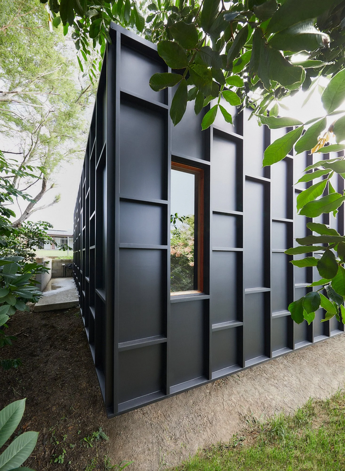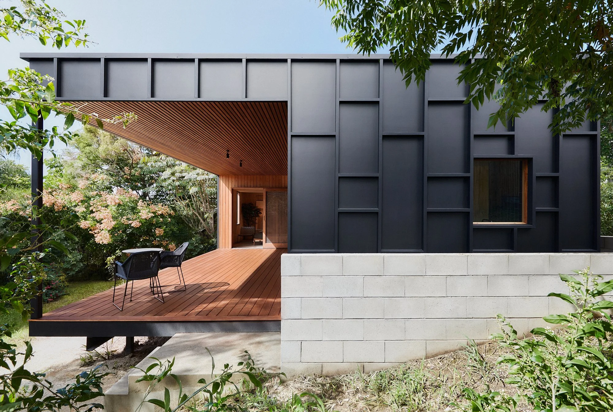 Wrapped in black FC sheet, vertical and horizontal battens cover the sheet joins to create a tectonic pattern that articulates the façade and defines the openings. An extrusion carved into the northern face forms a sheltered outdoor terrace, revealing a new material and opening up the dwelling to catch the sun’s movements throughout the day.
